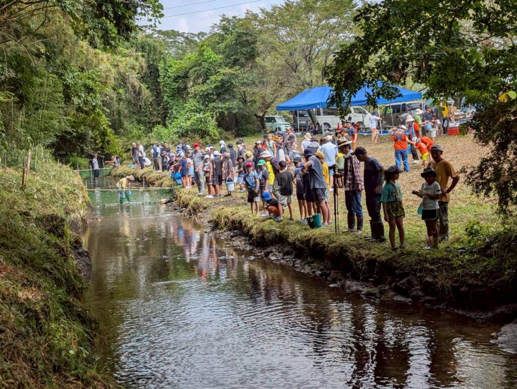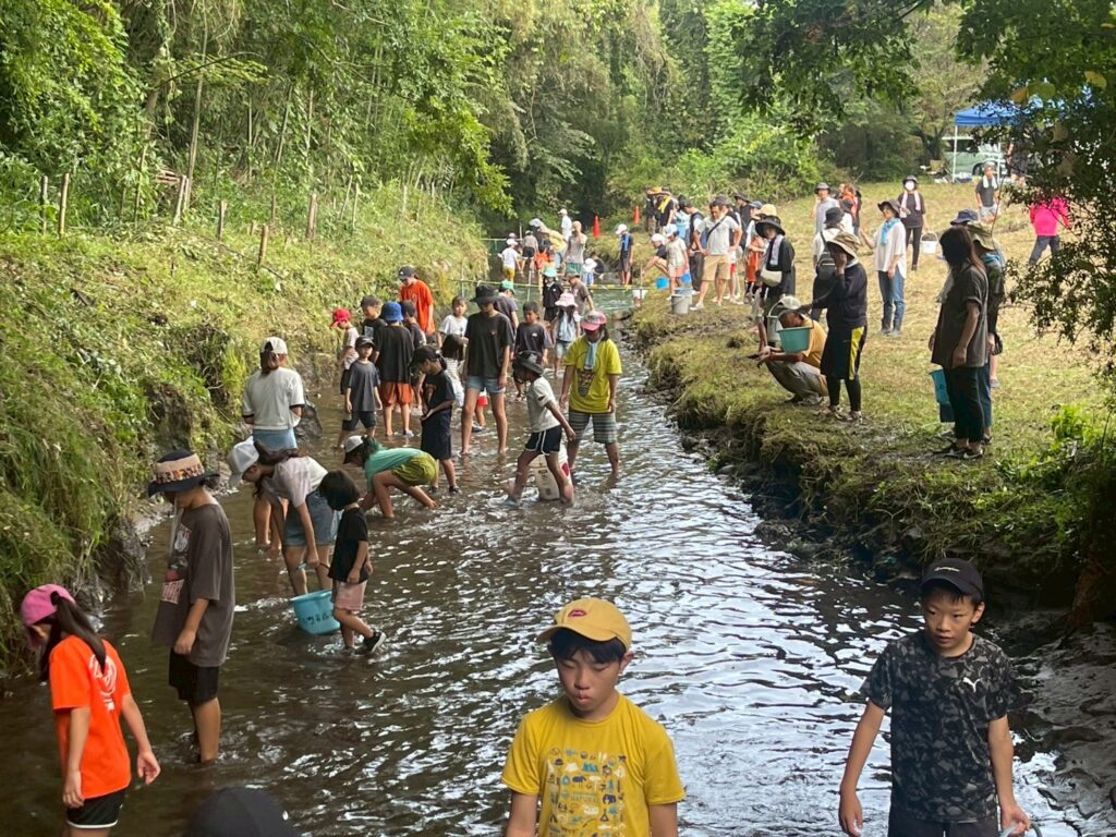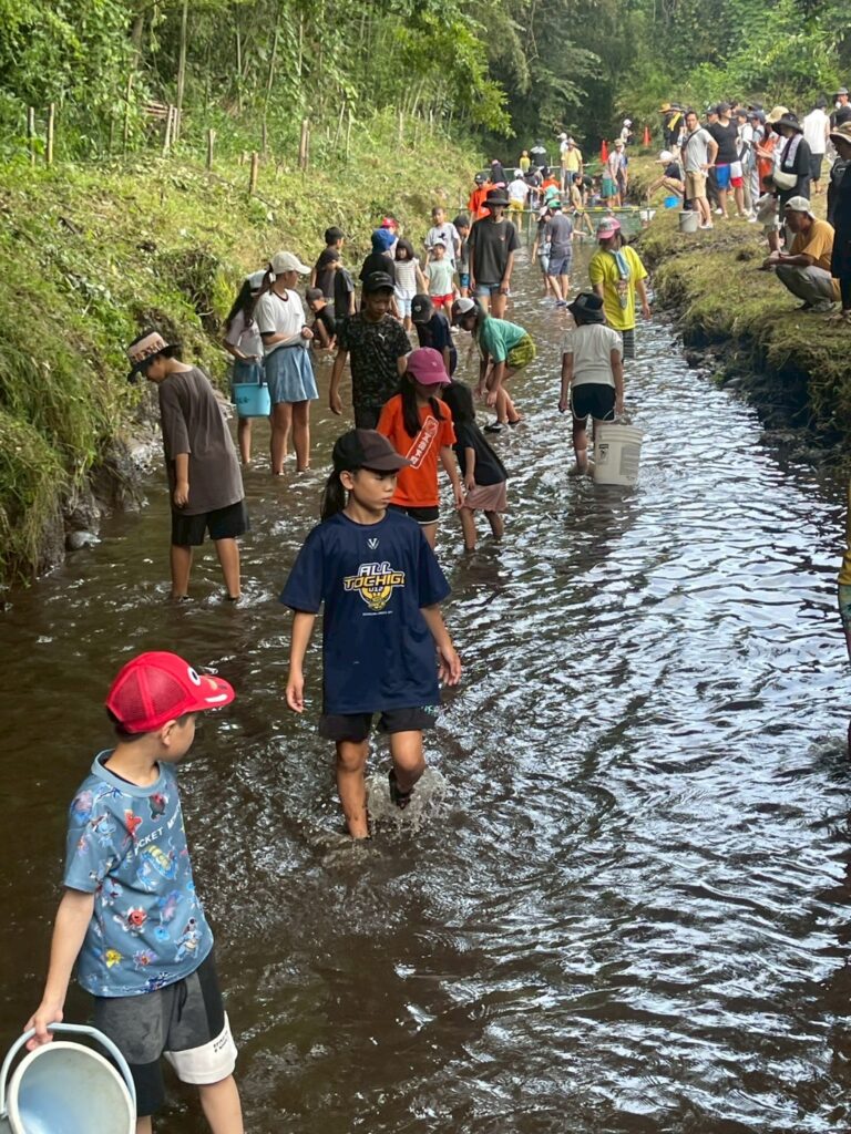 令和7年8月17日(日)に富屋地区まちづくり連絡協議会主催の青少年育成部会が実施したマスつかみどり大会が6年ぶりに行われました。参加者、総勢約200名(富屋特別支援学校の生徒達の参加も含み)となり大いににぎわいを見せた。富屋地区ならではの、大自然の中で体験出来る伝統ある行事で、次世代の子供達の為に経験をさせたいという思いから、地域の方々にもご協力を頂き盛大に行えることが出来ました。