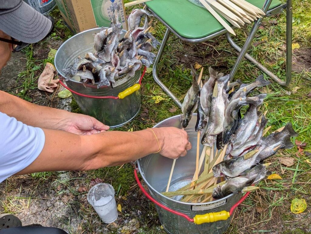 その後、子供達が掴み取ってきたマスを、各育成会等の親御さん達により裁き・串に刺し・焼いてその場でおいしそうに・楽しそうに食べている一面が見られました。その光景の中で、コロナ等により中々とれていなかった地域間のコミュニケーションの場ともなり富屋地区の団結力を図ることもできました。後日、参加者達のから「とても楽しめました」との声が多く寄せられ、今後も、地域の良さ感じ取れる行事事を行っていきます。