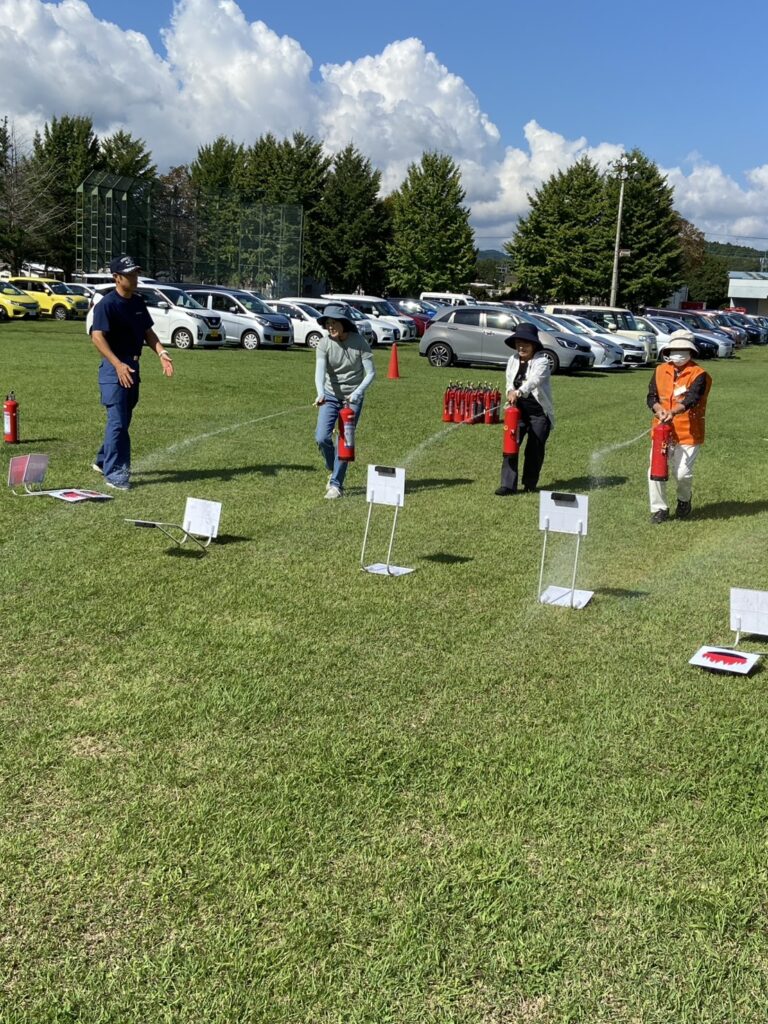 初期消化研修では、水消化機を使った消化訓練とバケツリレーでの消化訓練。