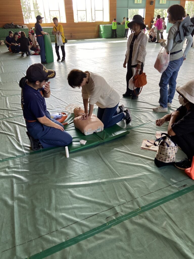 心肺蘇生法と応急処置な他、スマートフォンのカメラ機能を使ってのライブ119からの通報体験をしました。
