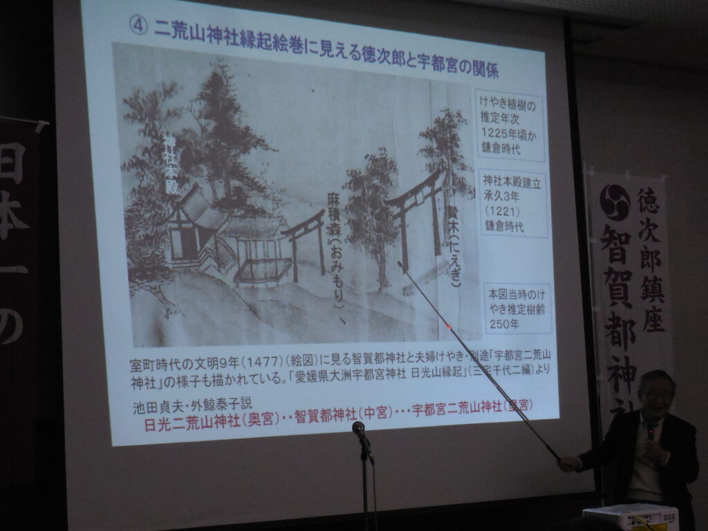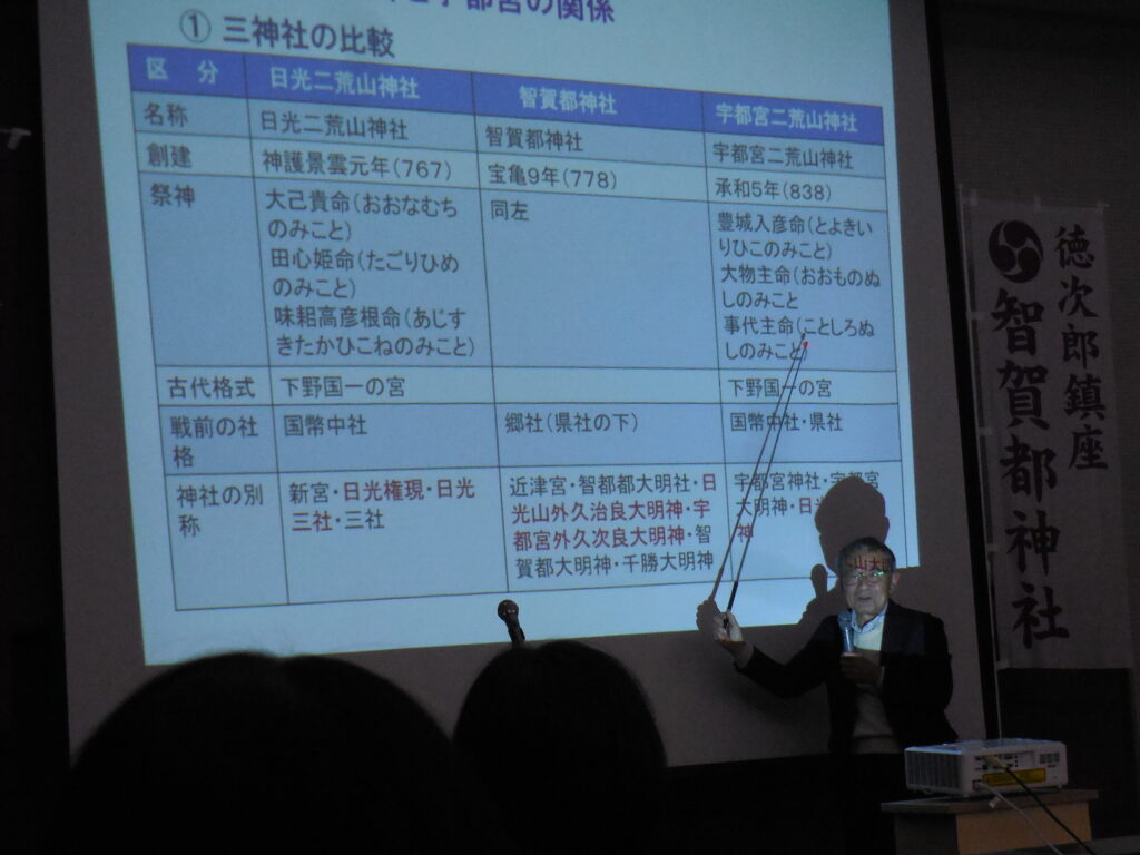 講演は、宇都宮市文化財調査員の池田貞夫氏を講師としてお招きし、「徳次郎・智賀都神社・夫婦けやき」について1時間にわたって講話をいただきました。智賀都神社のけやきは、けやきとしては県内で最も早く(昭和29年)に県指定文化財に指定され、2本揃うのは唯一で、樹高・幹回りは最大であり、東の株は県内最大ということです。この名木を中心に、宇都宮と日光を結ぶ最強のパワースポットとして、皆で地域を盛り上げていきましょう。