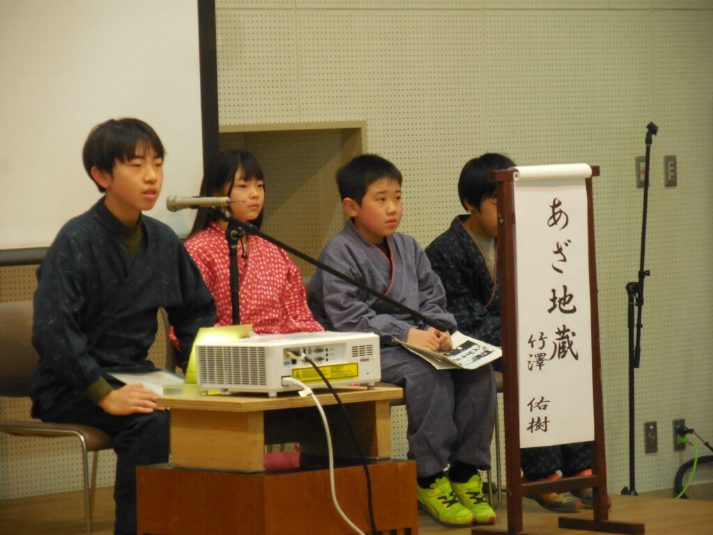 会に先立ち、富屋地区まちづくり5つの目標を参加者全員で唱和するとともに、特別発表として17年間続いている富屋小学校の民話語りが6年生4名により披露されました。