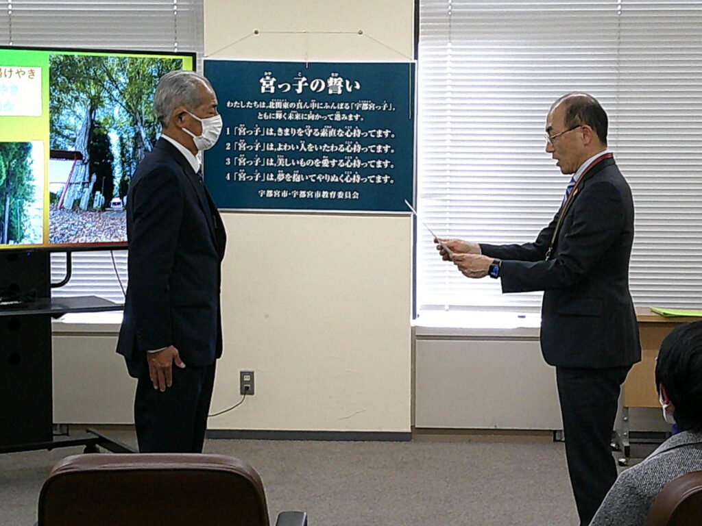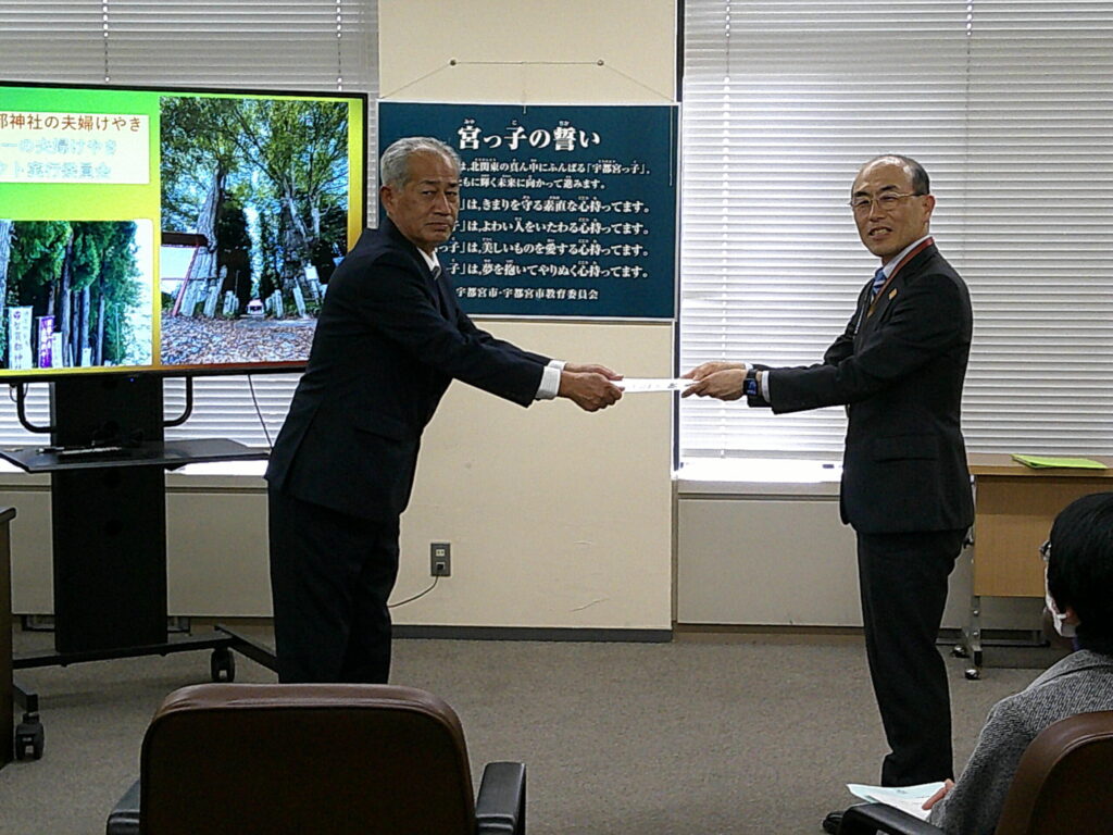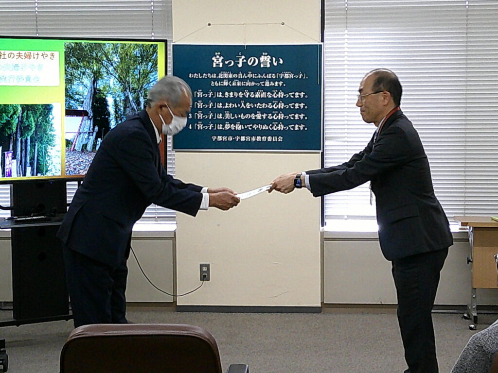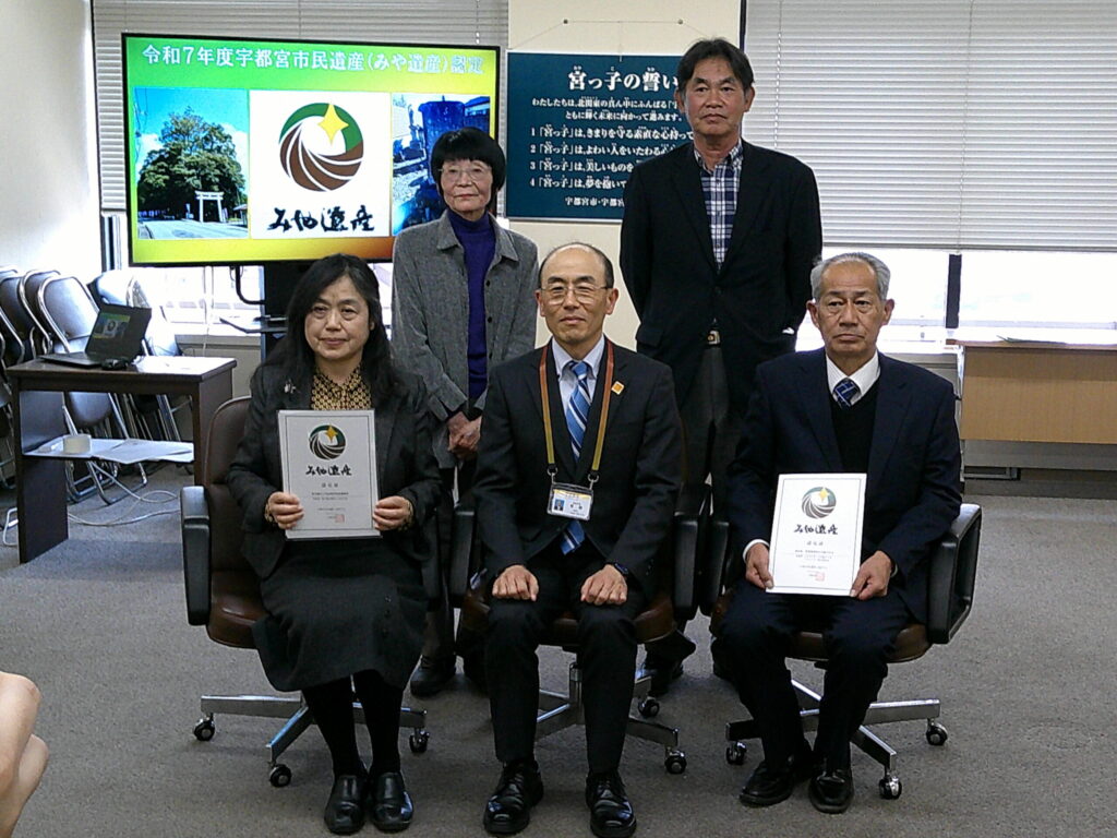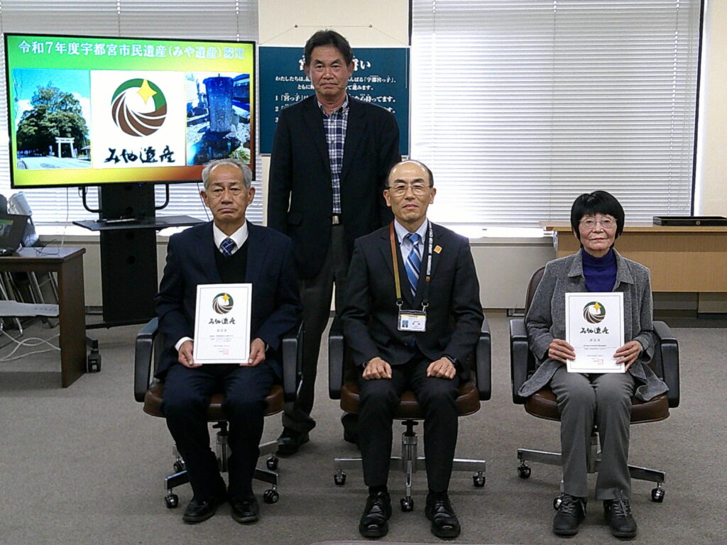 令和8年3月24日、宇都宮市役所にて宇都宮市民遺産認定証交付式が行われ、宇都宮市魅力創造部の青柳次長のあいさつに続き、本プロジェクト実行委員長の大橋正行さんが代表で認定証を受け取りました。